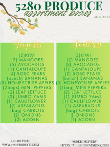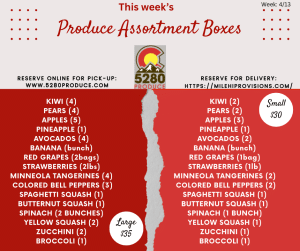 5280 Produce started their produce box program in 2013 with the goal of providing affordable, fresh produce to its customers on a weekly basis. We offer a small and large produce box at $35 and $30. Produce boxes will vary from week to week and details will be posted on this page and our Facebook page. Please note assortment box items may change due to availability and quality